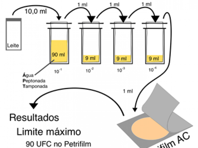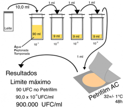 Para fazer a contagem de bactérias totais no leite cru, indicamos o uso da técnica de diluição seriada, que consiste na diluição na ordem de 10 vezes entre cada etapa. Para se chegar numa contagem de UFC para comparar com os valores estipulados pelas IN76 e 77, o procedimento deve ser iniciado com uma amostra de 10,0 ml de leite cru na temperatura descrita nas INs (4°C), lembrando de se coletar a amostra de forma asséptica. Coloque os 10,0 ml do leite em 90,0 ml de água peptonada tamponada estéril (APT) e nesse caso indicamos o uso do produto Flip-Top 3M que já vem devidamente preparado e pronto para o uso. Essa primeira etapa representa a diluição 10e-1 e os passos seguintes são transferir 1,0 ml dessa solução para uma nova APT com 9,0 ml (10e-2) e repetir esse processo por mais 2 vezes até termos a diluição final de 10e-4. O último passo é transferir 1,0 ml da diluição 10e-4 para um método de cultivo de bactérias totais, como o Petrifilm 3M AC e incubar a 32º C por 48h. Na solução que foi diluída 10 mil vezes (10e-4) a contagem máxima de UFC/ml deve ser de 30 para produtor rural, o que equivale a 300.000, e de 90 UFC/ml para estocagem no laticínio, representando 900.000. Assim, as quantidades de UFC acima de 31 e de 91, para produtor rural e laticínio respectivamente, representam valores reprovados.