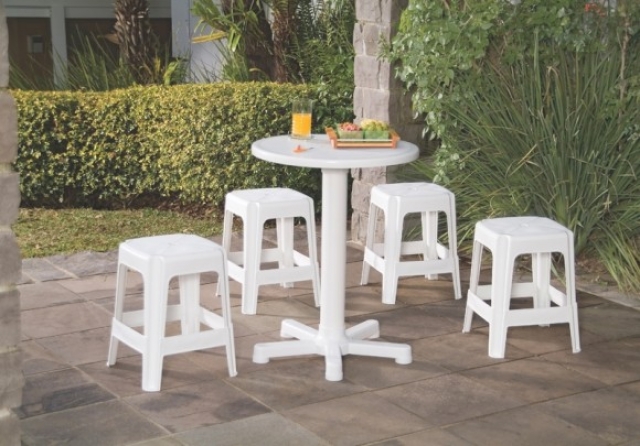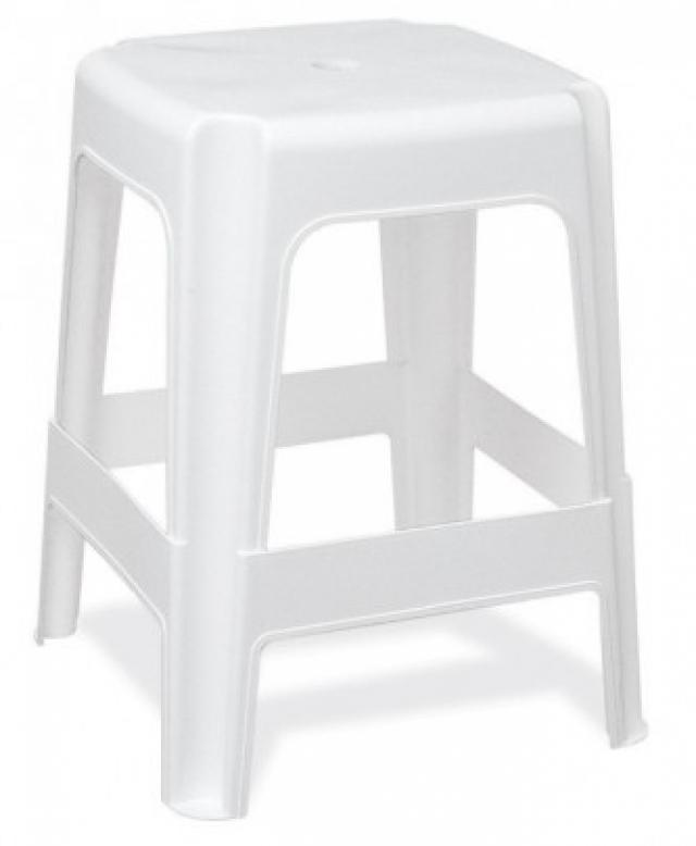Banqueta de polipropileno, na cor branca, pesando 0,950kg com resistência para até 120 kg. |