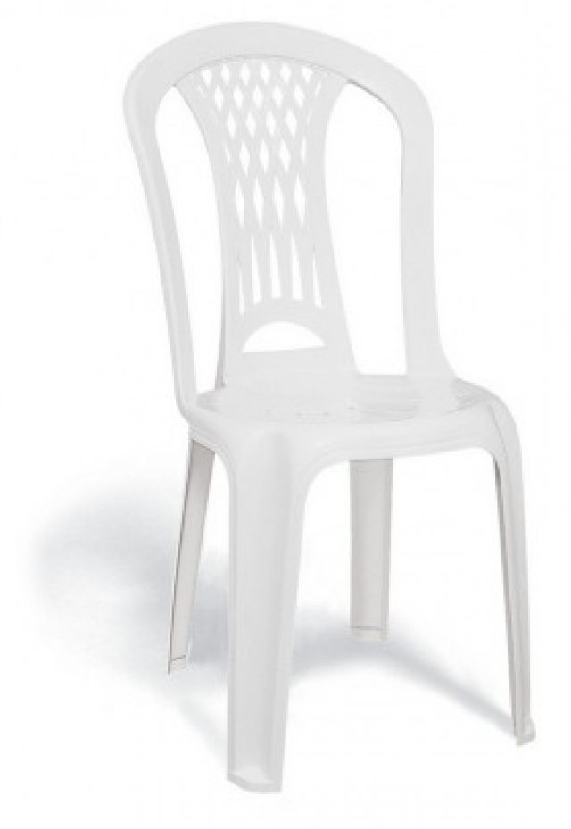 Cadeira monobloco de polipropileno, na cor branca, pesando 2,150kg. |