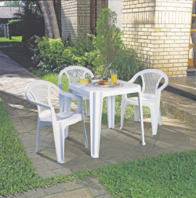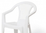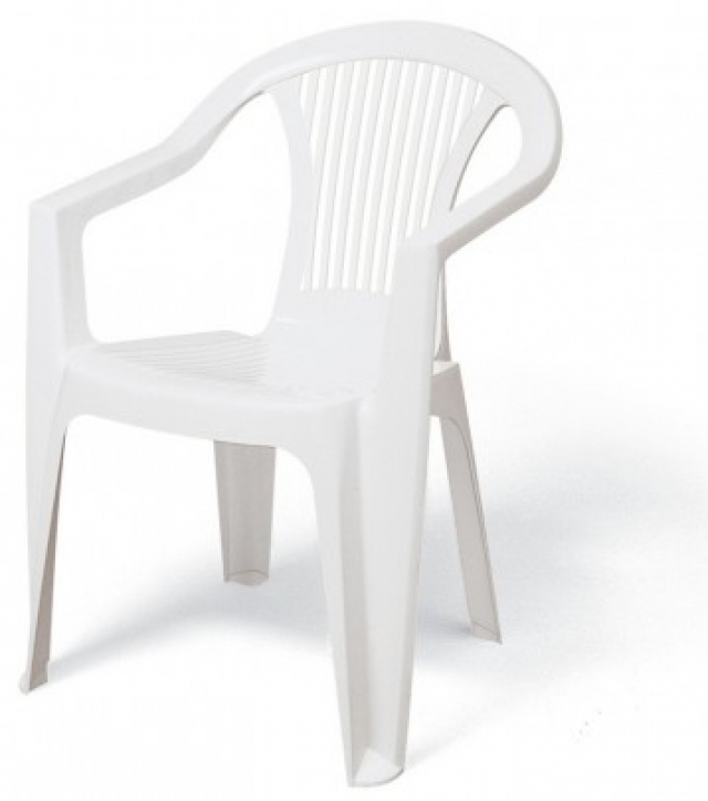 Cadeira monobloco com braços de polipropileno, na cor branca, pesando 2,500kg. |