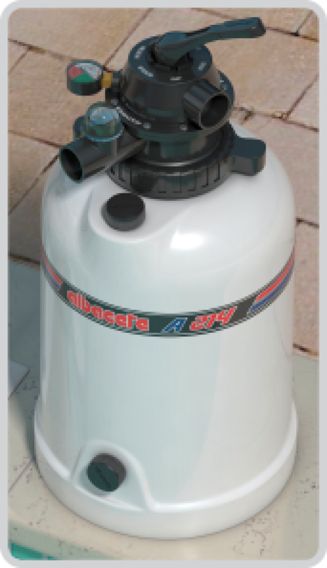 Os filtros Albacete série A são produzidos em resina de poliéster reforçada com fibra de vidro e acabamento em gel-coat, possuem válvula seletora de seis operações fabricada em termoplástico, reforçada com fibra de vidro.