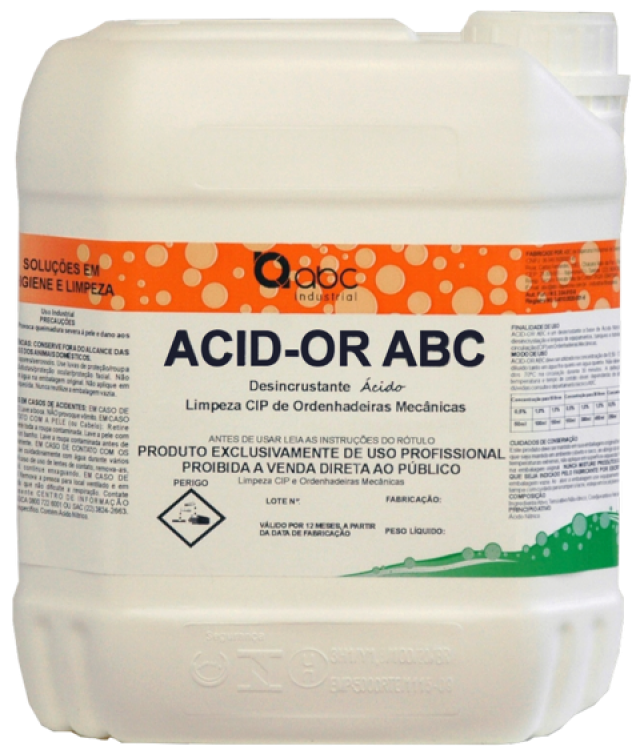 ACID-OR ABC é utilizado na limpeza CIP (circuito fechado) de tubulações e equipamentos nas ordenhadeiras mecânicas para a retirada de sujidades inorgânicas como a pedra de leite que é o principal facilitador da contaminação microbiana do leite ordenhado. O ACID-OR ABC podendo ser diluído tanto em água fria quanto em água quente, sendo sua melhor eficácia de limpeza em água quente. Utilizando a água quente, não deixe que a solução passe dos 70°C.